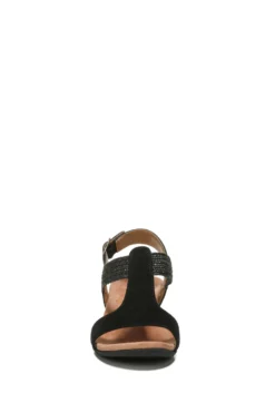 This t-strap wedge features a comfy mix of leather, stretch gore, suede and cork. A buckle ankle strap means easy adjustability.