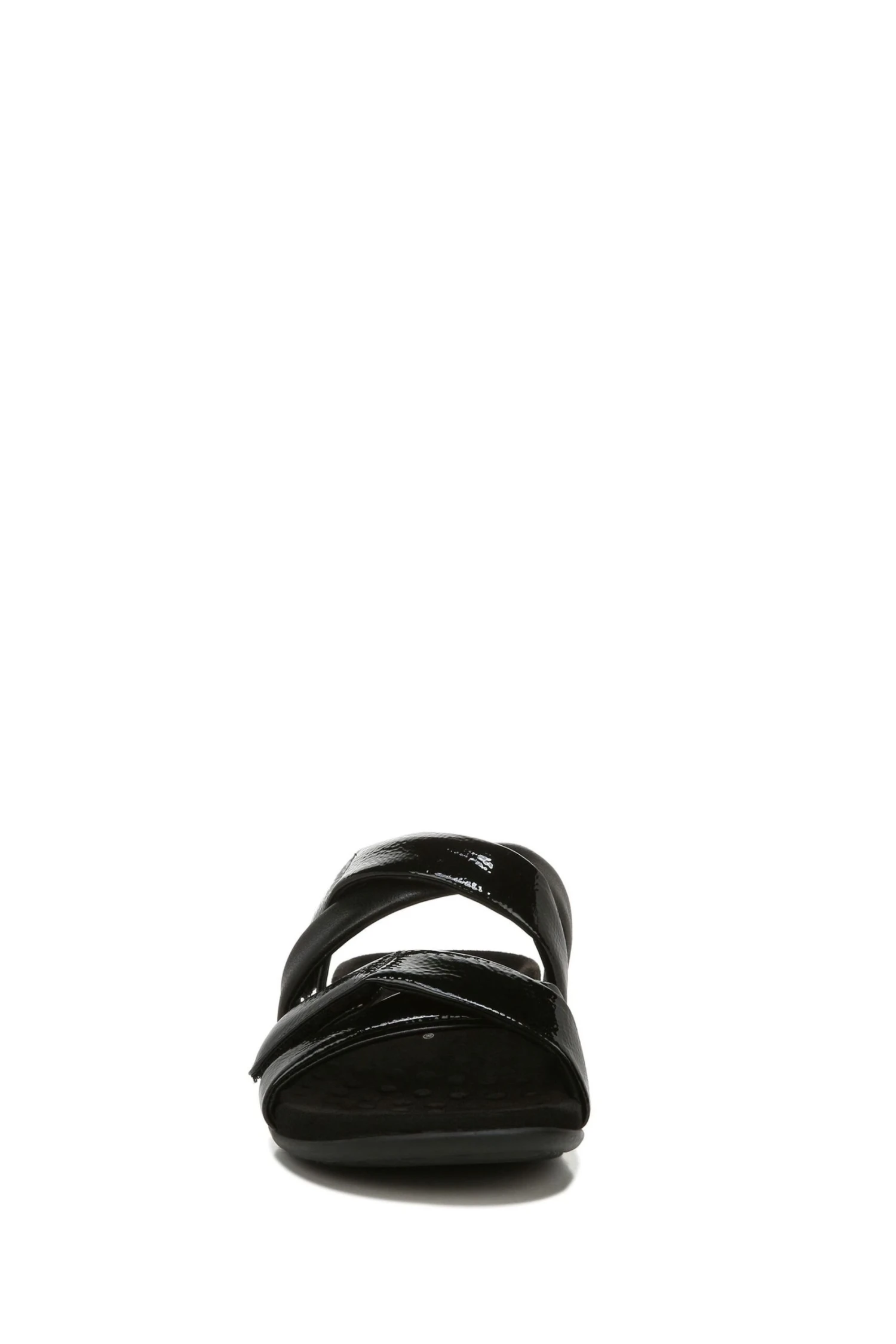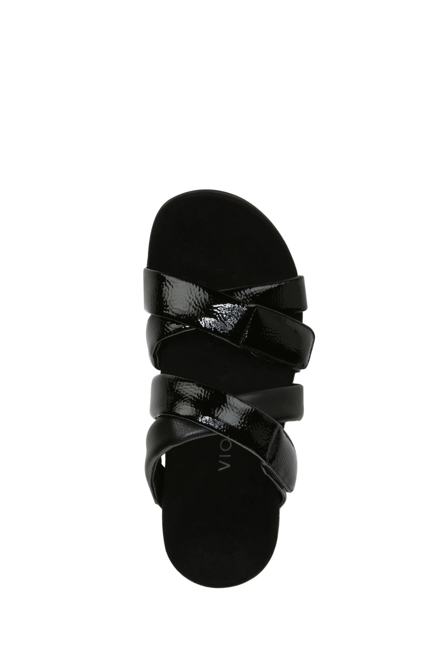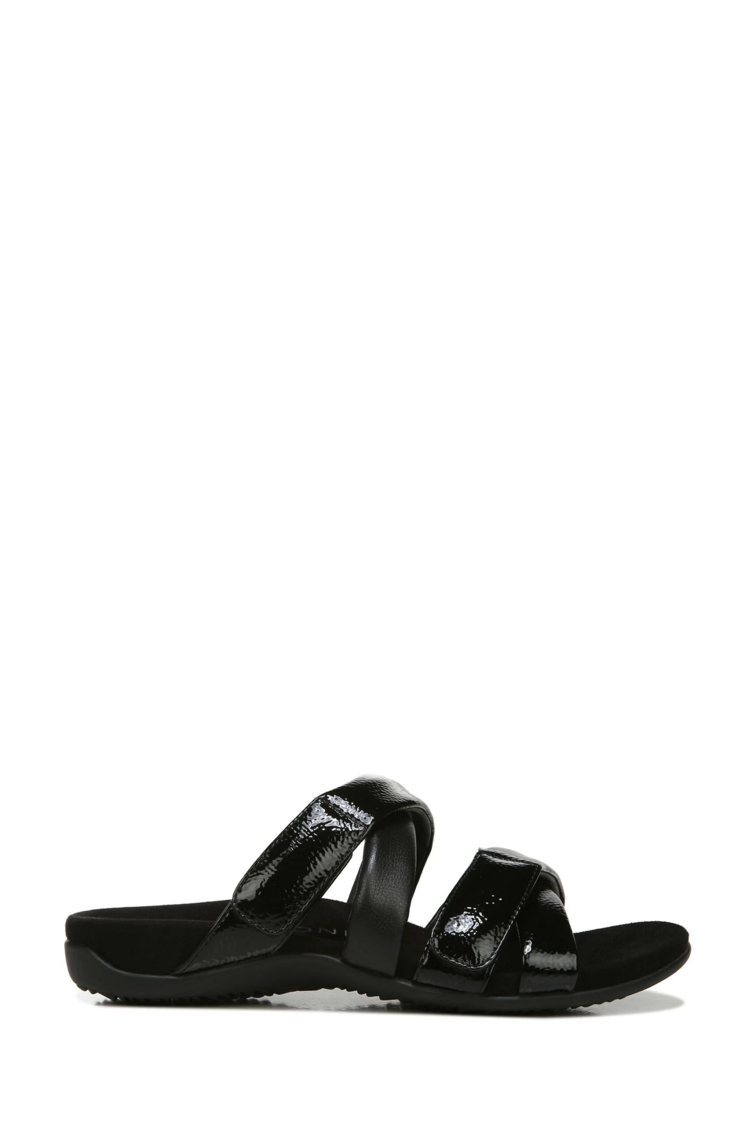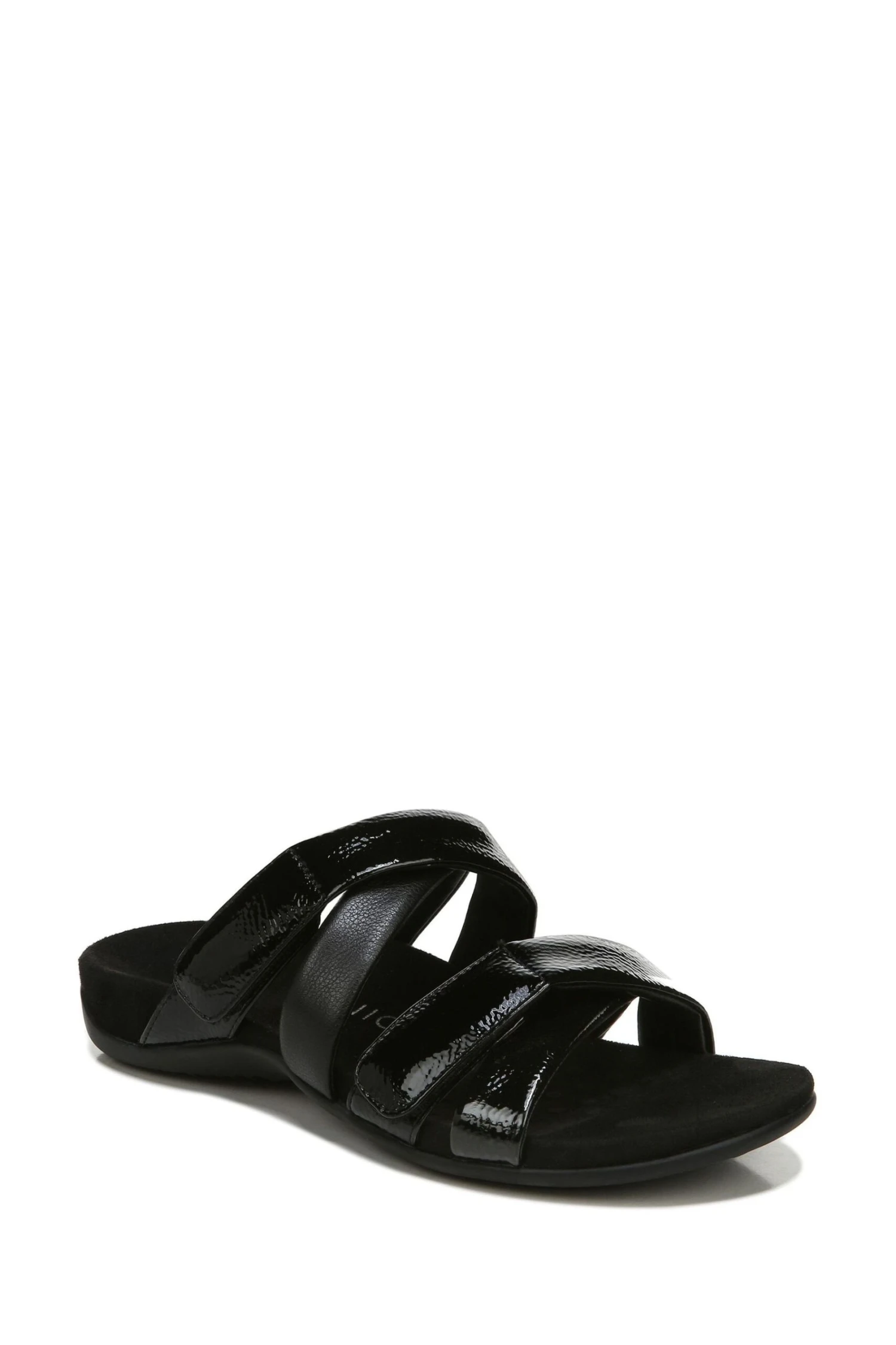 Strap it up! These casually chic, crinkle patent leather slides offer optimal fit with multiple hook-and-loop adjustment points.
