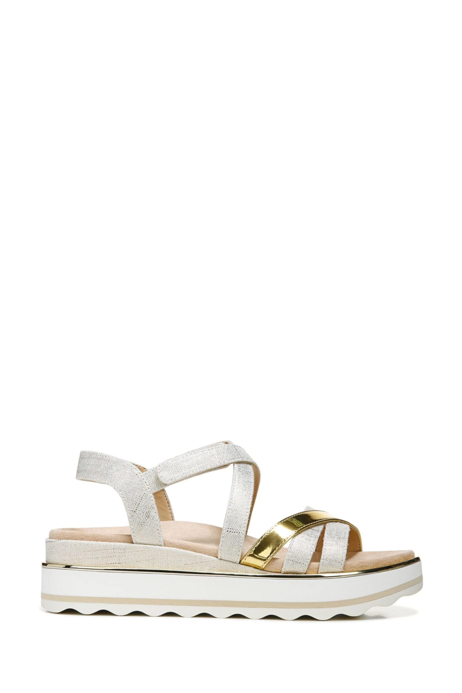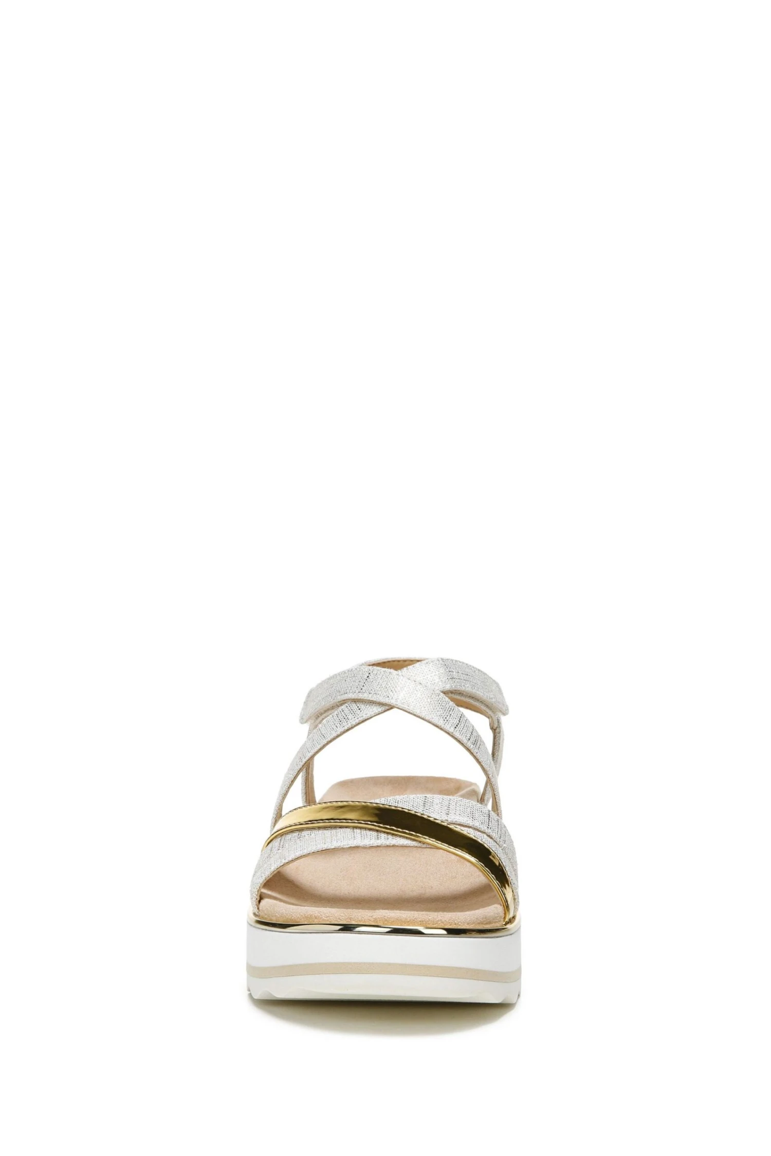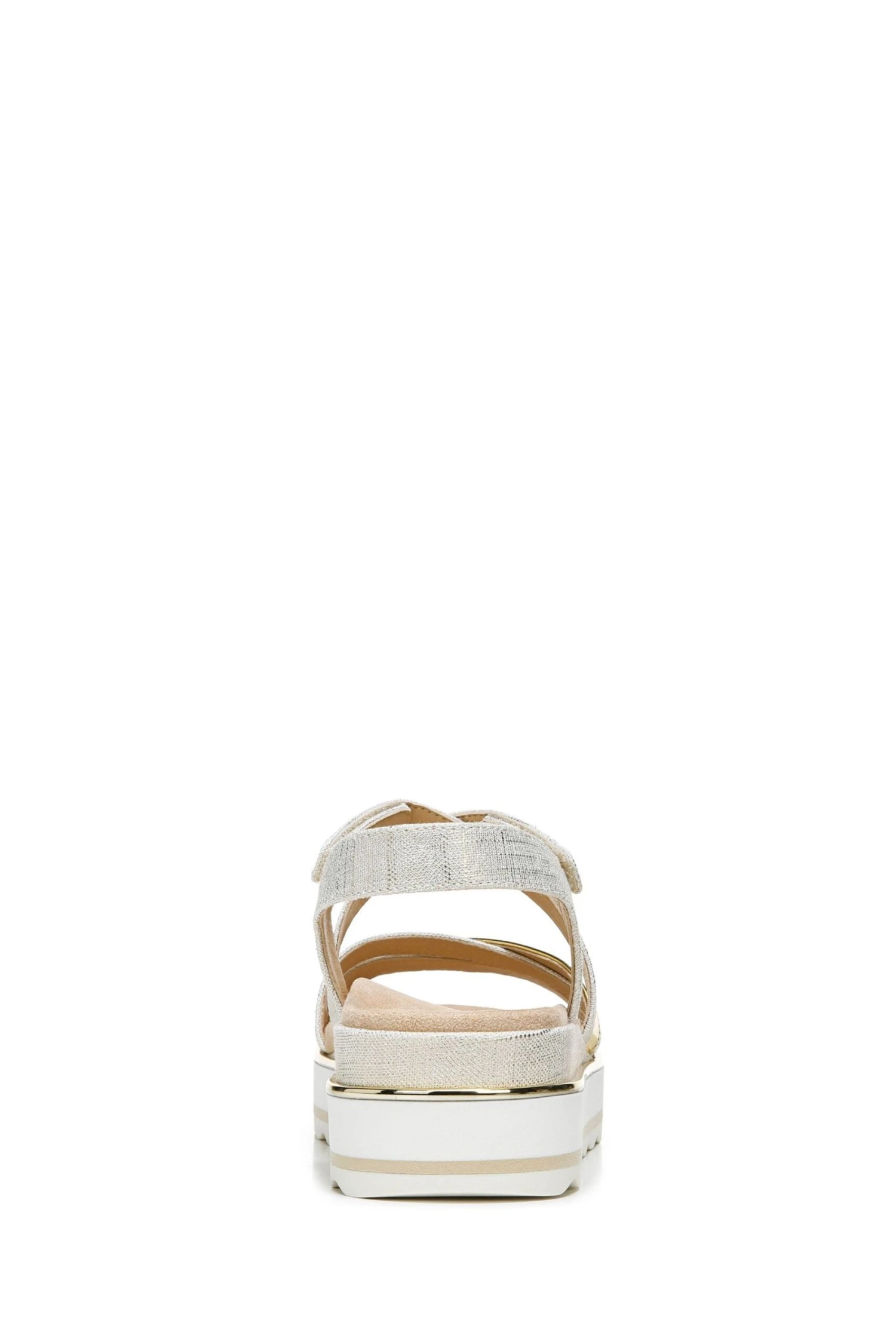 Metallic linen and mirror—a match made in shoe heaven. These chic flatform sandals offer neutral versatility with a pop of glam.
