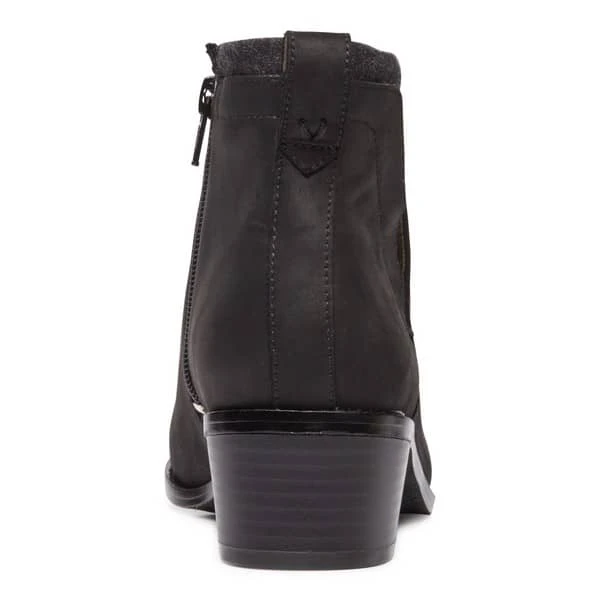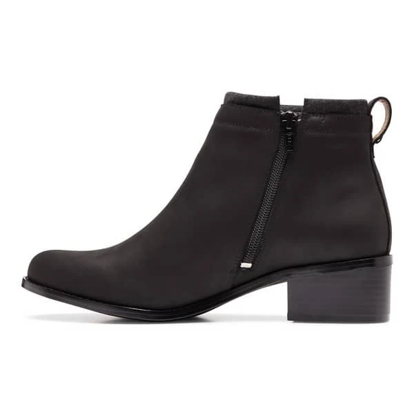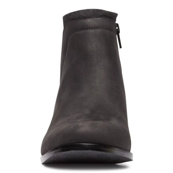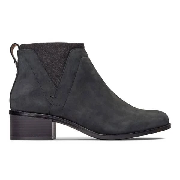 Joslyn is a leather ankle boot with wool accent. A stacked heel affords just the right amount of height.